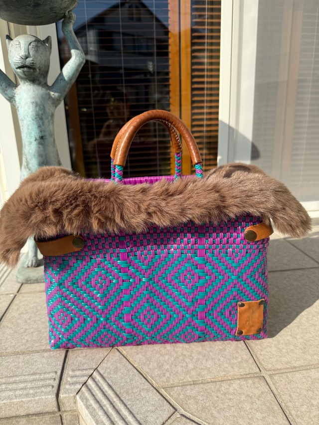 ナスタはスペイン語で「かご」という意味です。脇のレザーベルトを外すと幅が広がりお買い物かごのように使える便利な優れものです。伝統的なひし形(ロンボ)と花(フロール)模様で、紫色のジャカランダの花をイメージしています。 Size:370×235×175mm ※ハンドメイドのためサイズに誤差があります Brand--------------------------------------------------- Lady Paola メキシコのミチョアカン州の農村女性たちが出稼ぎに出ず、家族と暮らしながら世界に通用するブランドをというコンセプトの元に作られているバッグ。 ☑第1級の再生プラスチックを使用 ☑オールハンドメイド ☑通常のメルカドバッグと違い、かなりしっかりと編まれている ☑持ち手やタグはレザーを使用 ☑内布や内ポケットあり ☑自立するバッグ ---------------------------------------------------------