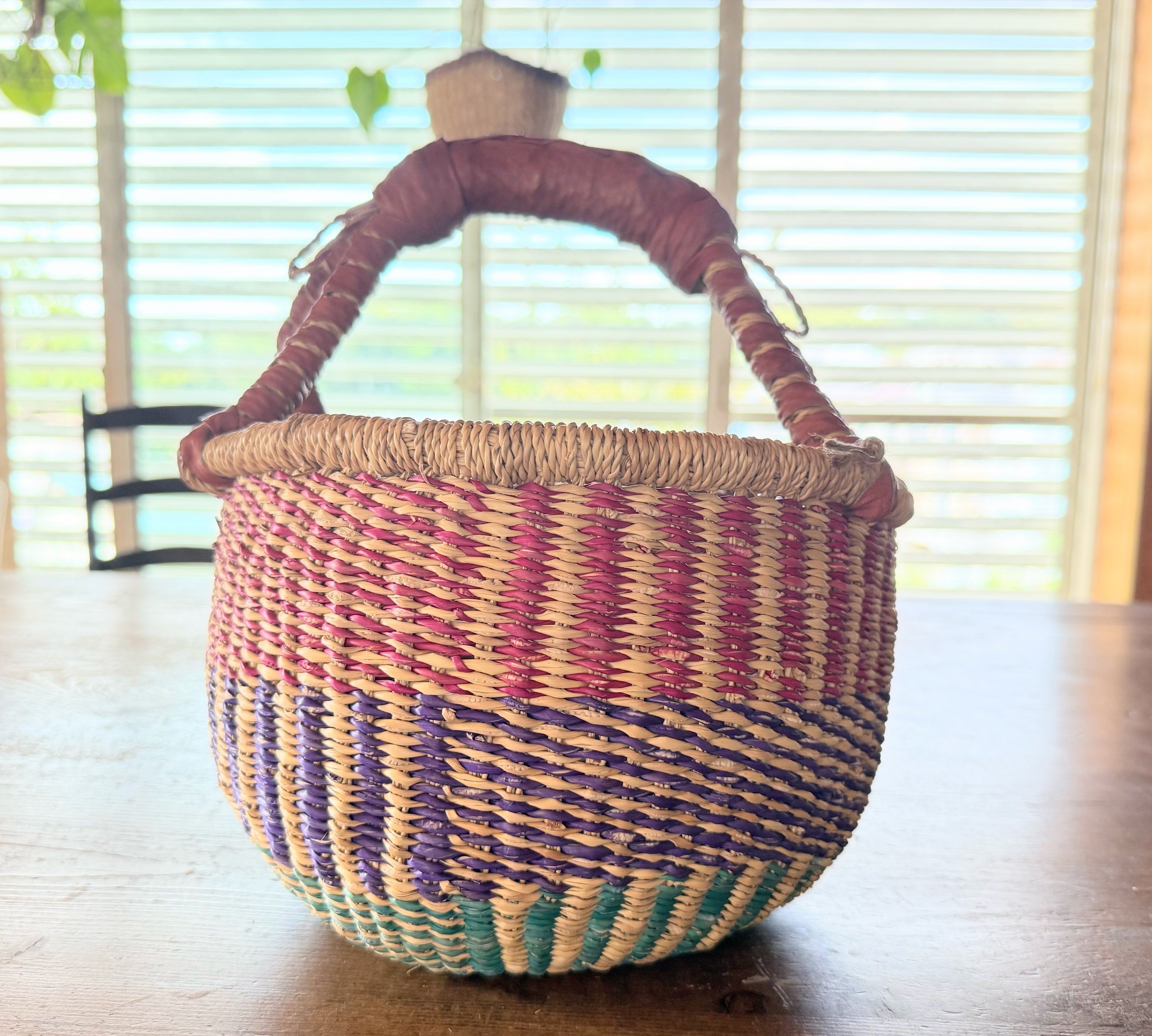 ブルキナバスケットは西アフリカ、ガーナのボルガ地方で編まれ、隣国ブルキナファソで革を付けてつくられた一本手のかごのことです。